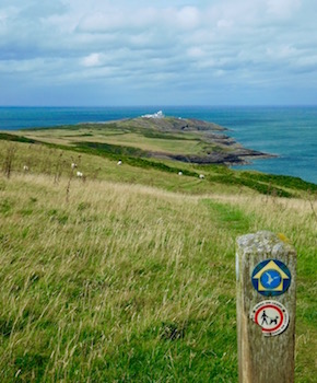 Approaching the lighthouse was really lovely. The path had earlier cut inland to pass through the yard of the Pilot Boat Inn (where I'd stopped for a cider) then back out towards the water, then inland to miss the estate, and then had skirted the edges of fields that dropped right off into the waves. After a short while, it started to climb hills, and eventually the lighthouse popped into view. Wonderfully, the sun decided during this 20 minute span to peek through the clouds, giving really lovely views of the lighthouse on it's promontory standing over the bright blue sea.