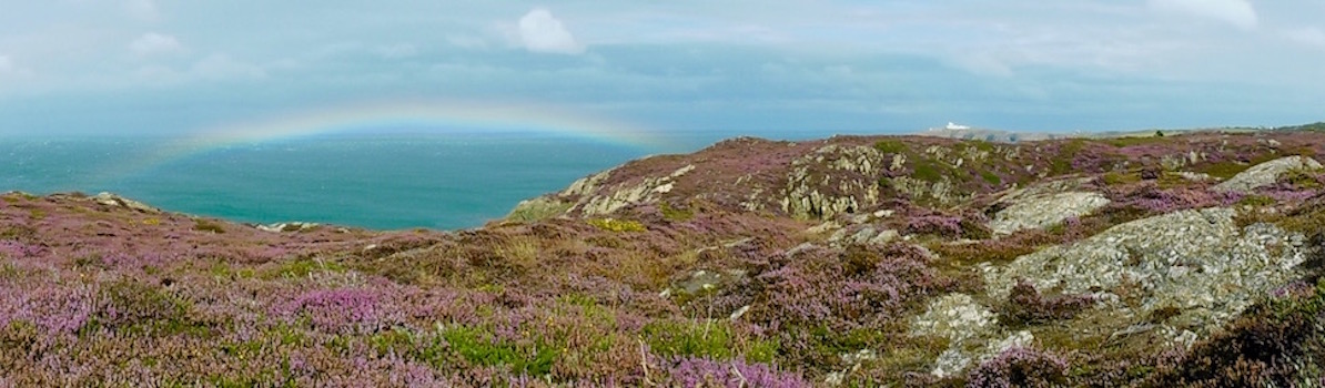 Anyhow, after the well, two things happened - first, the path began to undulate a lot more, and second, it started to rain. Not much, but enough to, you know, get me wet. But one of the grand benefits of this was that there was a rainbow. A tiny little rainbow in a tiny little cove with views toward the lighthouse. And I'm fairly certain I'm the only person that saw it - great kind of rainbow really.